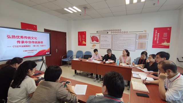 中华优秀传统文化是中华民族不断发展壮大的精神命脉,是增强文化自信的重要来源,我们有责任用中华民族创造的精神财富来以文化人,以文育人。9月25日中午12:30,文理教学部组织党员教师在南苑2号楼306会议室召开组织生活会,以“弘扬优秀传统文化,传承中华传统美德”为主题,开展《习近平谈治国理政》第三卷专题学习、交流,会议由秦禹权书记主持。