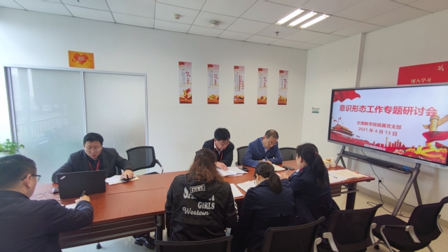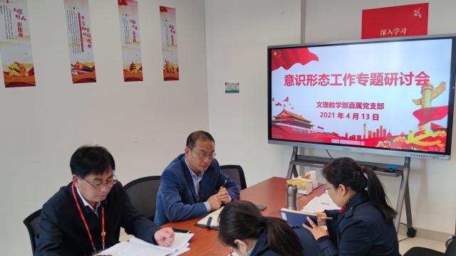为加强和改进新形势下教学部意识形态工作,贯彻落实学校关于意识形态工作的要求,提高教学部教师对意识形态工作的高度重视和正确认识,进一步做好教学部意识形态风险研判工作,理清日常工作思路,文理教学部于4月13日中午在南苑2号楼306会议室召开了意识形态工作专题研讨会。会议由教学部直属党支部书记秦禹权主持,主任耿铭、副主任侯丽英以及支部委员、工会主席参加会议,巡察员解晓峰列席了会议。