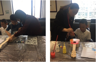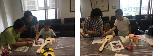 在老师的指导下,孩子和家长认真学习尤克里里的制作,自己亲自动手组装乐器,并且在乐器的表面也画上自己喜欢的图案来装饰。孩子们在制作过程中感受创作的乐趣。制作乐器并装饰乐器的过程,对儿童的创意性开发以及发掘潜在能力有显著的效果。