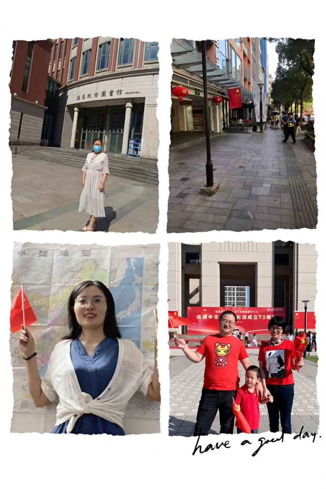 董鸽老师虔诚走进红色泥城主题馆,感悟浦东儿女在革命时期的英勇热血及建设时期的果敢创新。戴怡文老师积极打卡中共一大会址,从源头欢庆建党百年。李兰英老师凝视四行仓库的满墙弹孔,感怀先烈们的英勇拼搏,勿忘历史,铭记英雄。陆理原老师追剧赤诚报国“黄大年”,为科研不懈奋斗精神,当为时代楷模。王宏杰老师驻足中共一大会址,感受我党成立的艰辛,为身为一名党员而自豪。侯丽英老师打卡湛恩纪念图书馆,传承先辈奋斗精神,倾心投入科研,培育祖国栋梁之才。卜茹雯老师举家观看学校升旗仪式,庆盛世华诞,迎祖国国庆。梁莺瑜老师深情抒发普通百姓对美丽中国的祝福,魔都共欢歌,奋进新时代。付艳君老师徜徉多伦路文化名人街,追忆没有围墙的红色印痕。焦建利老师返乡途中不忘参观杨根思烈士陵园,缅怀先烈,寄托哀思和敬意。闵建中、周艳丽、秦禹权三位老师走进影院,观看电影《长津湖》,回望“抗美援朝”艰苦岁月,感受气壮山河的战斗场面,接受抗美援朝精神的洗礼,倍加珍惜来之不易的美好生活。孔平老师携幸福小家祝福祖国生日快乐,永远繁荣昌盛。