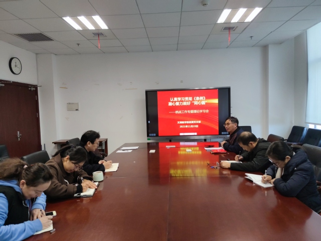 会上,书记秦禹权对新修订的《中国共产党统一战线工作条例》进行了解读,着重讲解了统一战线工作原则、工作范围、突出特点、修订亮点、修订后的《条例》在明确新时代统战工作总体要求方面作的新规定等内容,深刻领会习近平总书记关于加强和改进统一战线工作的重要思想和党中央最新决策部署有关精神。与会同志围绕《条例》学习进行了热烈的交流,大家表示,中国共产党领导是统一战线最鲜明的特征,坚持党的领导是统一战线最根本、最核心的问题,要把统一战线这一重大法宝在思想上立起来,在行动上动起来,在实践中用起来,要深入贯彻落实。与会同志还就学科建设与发展方向、教学评价与人才培养、民主党派与统战团体发展、工作作风与学风建设、资源共享等方面问题进行了热烈讨论,提出了建设性意见和建议。