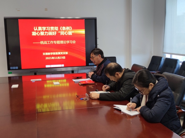 为贯彻落实中央、市委、校党委统战部关于扎实抓好《中国共产党统一战线工作条例》学习培训和宣传解读有关工作要求,为教学部和学校统战工作高质量发展打下坚实的理论基础。11月23日中午,文理教学部直属党支部组织召开了“认真学习贯彻《条例》,凝心聚力画好‘同心圆'”统战工作专题理论学习会,会议由秦禹权书记主持,党政班子、支委成员、组织员参加了专题学习会。